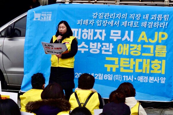 마트에서 일하는 근로자들의 입장을 전달하는 마트 노조원들이 사람들이 북적이는 홍대 앞 애경 본사 앞에서 목소리를 모았다. 우리사회에 아직도 만연해 있는 갑질 습성이 남은 관리자들의 행태를 고발하기 위해서다. 주최 서비스연맹이 내건 모임의 슬로건은 다음과 같다. 직장내 괴롭힘 피해자 입장에서 제대로 해결하라! 피해자 무시 AJP, 수수방관 애경 규탄. 6일 11시 해당 건물 앞에서 현장의 목소리를 그대로 담아봤다. 이들은 이마트, 코스트코, 홈플러스 등 국내 대형마트 현장 종사자다. 애경은 이들 마트에 물품을 공급하는 회사이고, 자획사인 AJK를 통해 직원을 운용하고 있다. 두 회사는 물론 하나다. AJP 관리자의 갑질을 묵인해 왔다는 것은 곧 애경의 이야기. 사회는 배준경 마트산업노동조합 조직국장이 맡았다. 그는 “AJP는 갑질 관계자 문제 제대로 해결;모든 피해자를 갑질 관리자와 분리할 것.애경은 노동자 수 개선할 것”이라고 구호를 외치면서 집회의 포문을 열었다. 그가 내려오자 첫 발언대에는 조혜경 마트산업노동조합 AJP 지회장이 섰다.