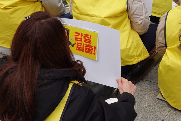 한 노조원이 ‘갑질퇴출’이라는 구호를 적은 피켓 종이을 들고 있다.