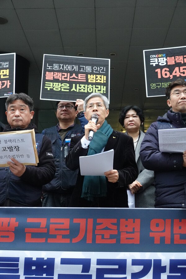 권 변호사는 “쿠팡이 블랙리스트를 작성하고 사용하는 행위는 헌법상 국민의 직업의 자유와 근로의 권리를 침해하고 노조 가입 및 활동을 이유로 불이익을 주는 부당노동행위로 노동3권을 침해하고, 나아가 개인정보를 수집 목적 범위를 초과해 목적 외의 용도로 이용함으로도 비밀 기호 또는 명부를 작성・사용하여 근로자의 취업을 방해하는 행위를 금지한 근로기준법 제40조, 노조가 입을 이유로 한 불이익 금지를 규정한 노동조합 및 노동관계조정법 제 81조 제1호, 개인정보의 목적 외 이용을 금지한 개인정보보호법 제18조 제 1항과 제 2항을 위반한 범죄행위로서 중대한 공익침해행위”;라며 “오늘 쿠팡대책위 등 제 시민단체들은 국민의 기본권을 침해하고 헌법 질서를 유린하고 있는 쿠팡의 블랙리스트 작성 및 사용에 대해 진상을 밝히기 위해, 특별근로감독 신청서와 고발장을 제출합니다. 고용노동부와 경찰은 철저히 조사 감독와 수사를 통해 쿠팡의 헌법 유린 행위에 대해 엄정한 법적 조치를 취해줄 것”을 촉구했다.