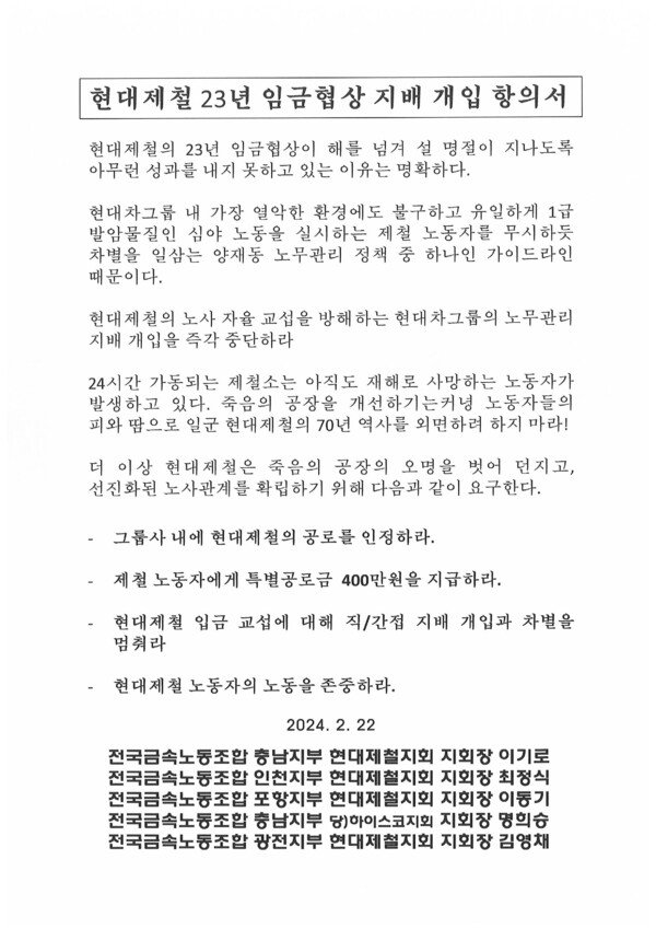 이어 “작년 우리의 요구안은 특별공로금 지급, 그리고 성과금으로 영업이익 25%를 요구했고, 400%+1300이면 저희 회사 평균 2700정도 되며 저희 노동조합은 이전 회사 제시안에서 400만원 이상의 특별공로금을 더 요구해 약 3100만 즉 22년 영업이익의 25%를 맞추려는 점”이라고 덧붙였다. 한편, 양재 본사에 제출된 ‘현대제철 23년 임금협상 지배 개입’ 항의서의 내용은 다음과 같다.